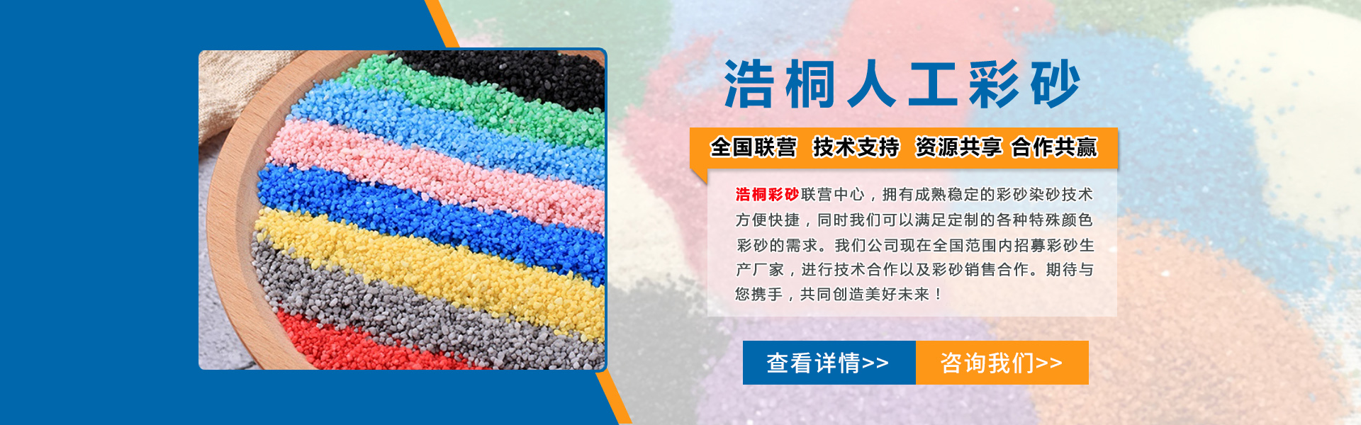 人工彩砂是經(jīng)過精致石英砂染制而成的,具有不褪色的特點,色彩鮮艷及色彩品種多,色彩牢固、持久。